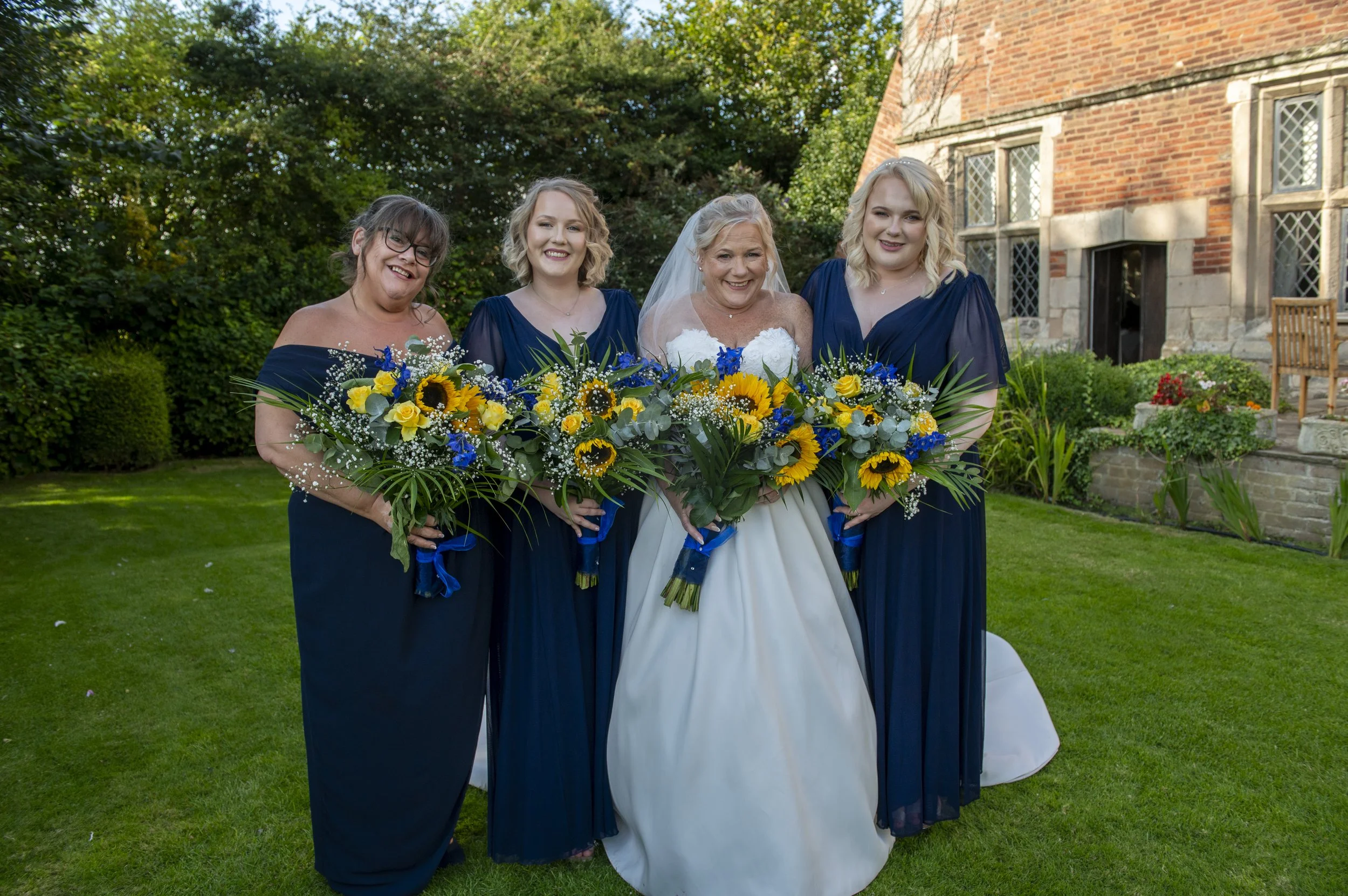 As guests began to arrive, they were greeted by glorious sunshine—perfect for the outdoor ceremony. Sandra, radiant and ready, shared an emotional first look with her dear friend Asda, who had the honour of walking her down the aisle. Her gown, a satin masterpiece with a sweetheart neckline and a breathtaking train, was paired with a vibrant bouquet of sunflowers and navy blue accents—a stunning combination that captured her warmth and elegance.